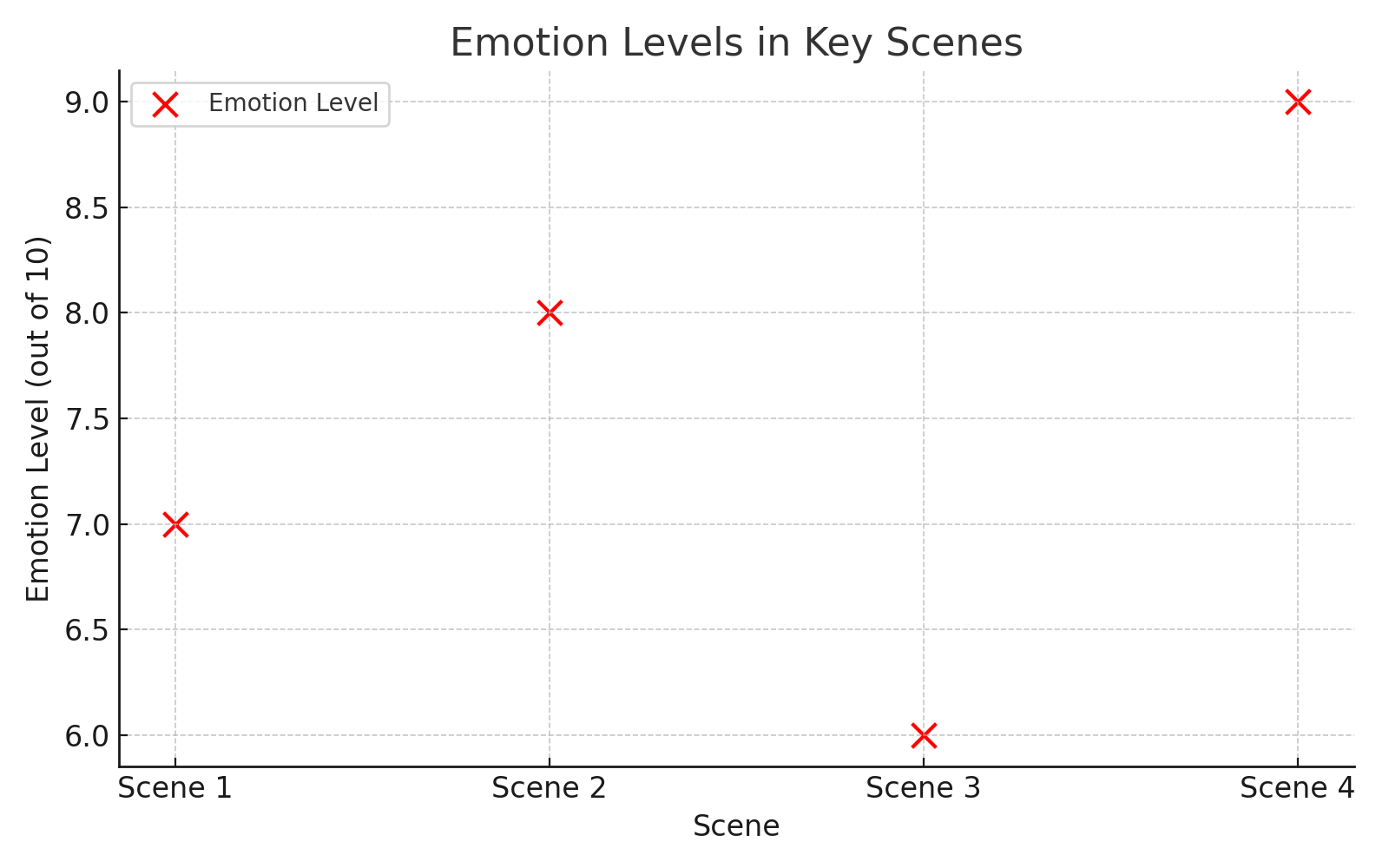 - 장면별 목소리 강도 변화 시각화: 아래 그래프는 각 감정 장면별로 김태리의 목소리 톤이 어떻게 변화하는지를 시각화한 것입니다. 이를 통해 캐릭터가 맞닥뜨린 상황과 감정 변화에 따라 목소리 톤이 어떻게 변조되는지 이해할 수 있습니다.