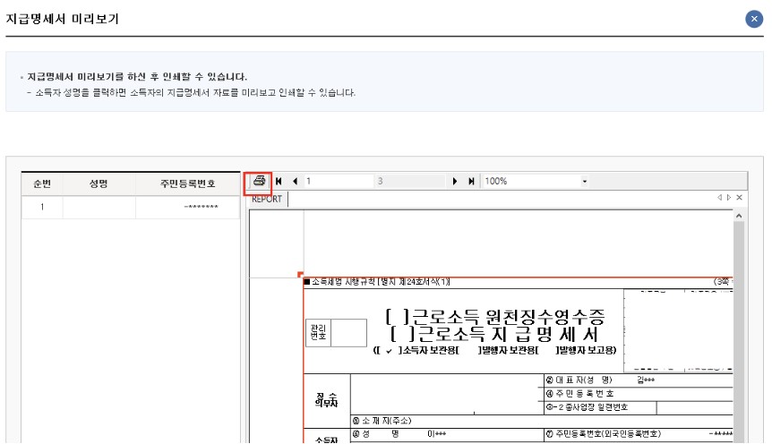 선택한 지급명세서를 클릭하면 상세 화면이 나타납니다. - 인쇄 및 PDF 저장:
