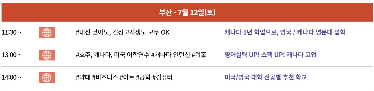 위는 2025년 7월 12일 토요일에 진행되는 부산 유학박람회 세미나 시간표입니다.